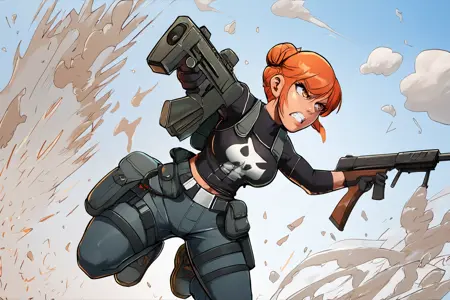 拉切尔·科尔-阿尔维斯在婚礼当天家人和丈夫被谋杀后,与惩罚者联手。她亲自戴上了骷髅标志,是迄今为止最出色的惩罚者版本之一。Lora for Pony 在与其他风格 Lora 一起使用时略显过强。如果有问题,请告诉我。
