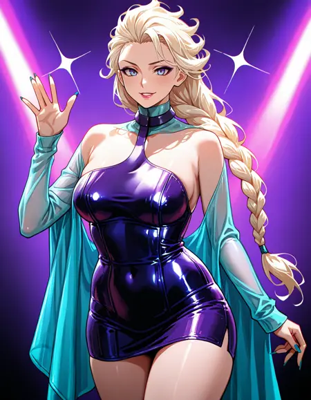a30n, purple corset, black hair, hair slicked back, short hair, (harness), clothing cutout), rubber, choker, skirt, see-through sleeves
