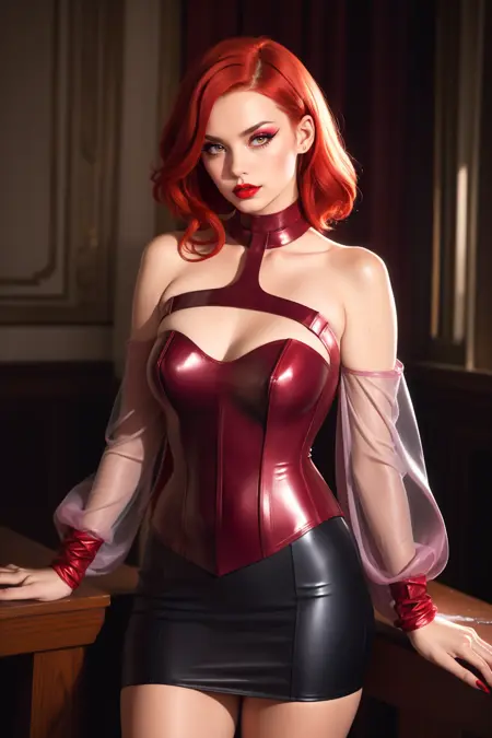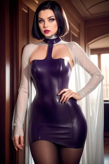 a30n, purple corset, black hair, hair slicked back, short hair, (harness), clothing cutout), rubber, choker, skirt, see-through sleeves