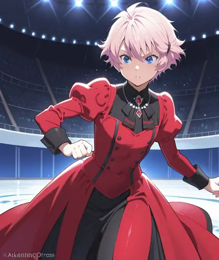 masterpiece,best quality,amazing quality,akimitsumochi++, akimitsumochi, pink hair, solo, necklace, short hair, dress, red dress, blue eyes, jewelry, 1boy, male focus, long sleeves, askatingdress+++, in skating arena , dramatic , elegant, highly detailed, digital painting, artstation, concept art, smooth, sharp focus, illustration, art by artgerm