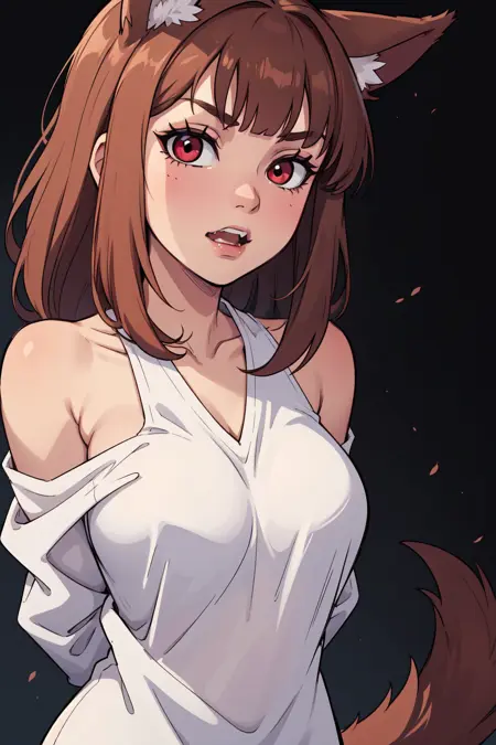 holo, Ookami to Koushinryou,fangs, tail, real dog ears, red eyes, brown hair, long hair,<lora:HoloSpiceAndWolf_TEKKIO:0.7>