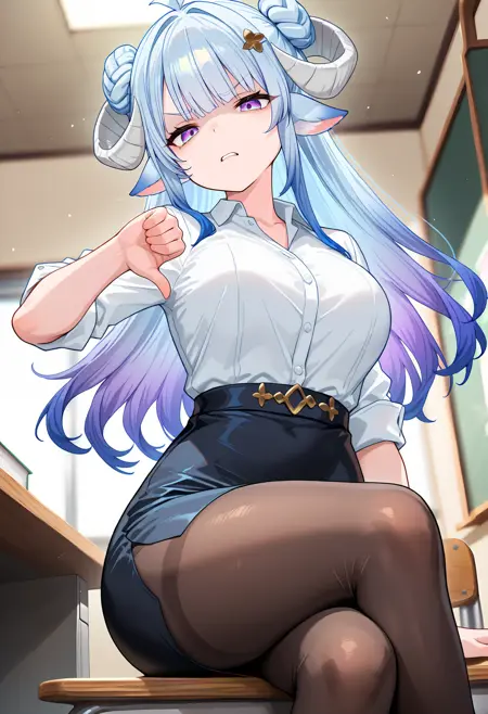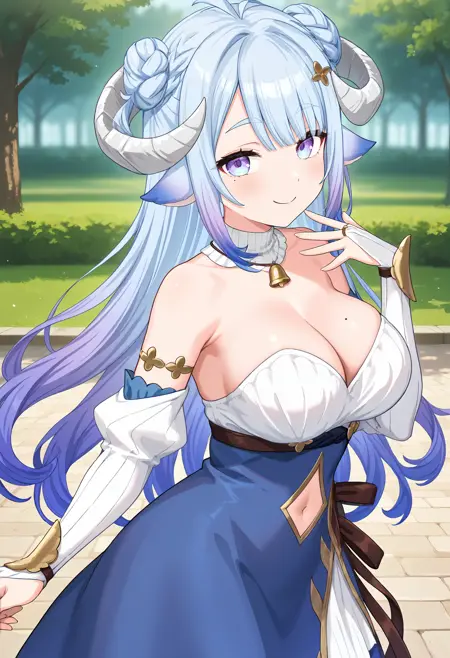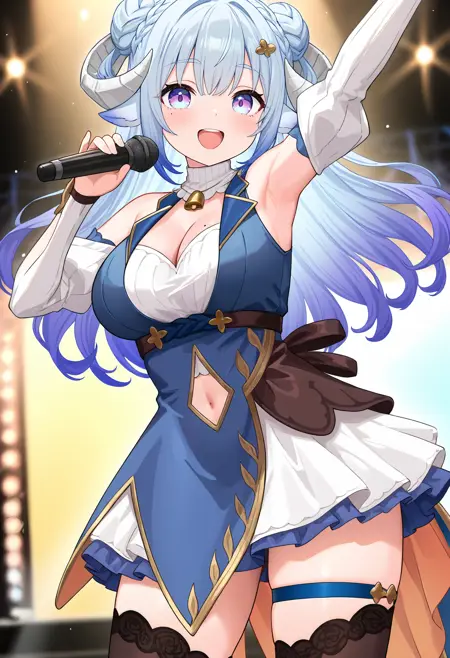 使用 waistcoat / strapless 控制她上半身的蓝色马甲(?)。