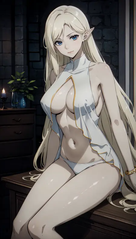 blonde hair, long hair, blue eyes, pointy ears, white top, white bikini bottom,  halterneck, bracelet