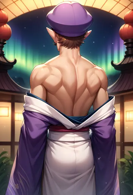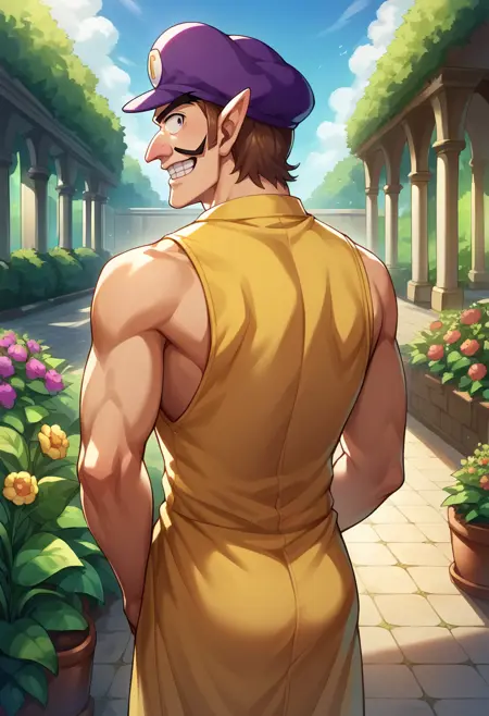 Waluigi, mustache, teeth, pointy ears, brown hair, hat, purple headwear