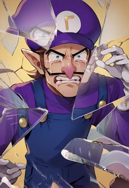 Waluigi, mustache, teeth, pointy ears, brown hair, hat, purple headwear, purple shirt, long sleeves, overalls, white gloves, brown shoes
