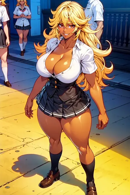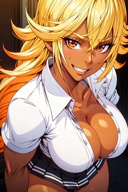 dark-skinned female, gyaru, blonde hair, long hair, brown eyes, huge breastsAttire