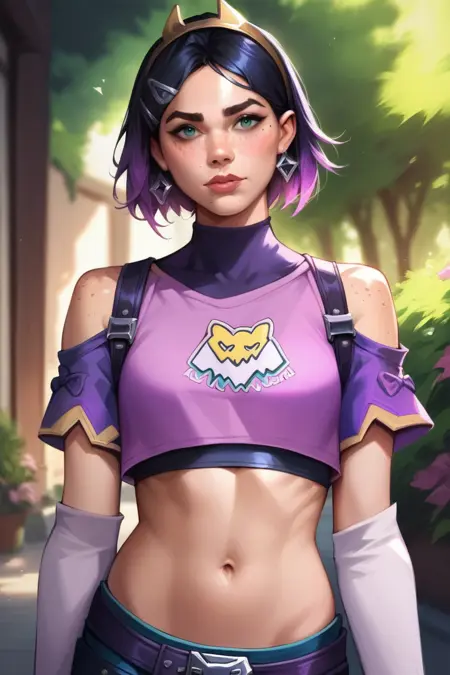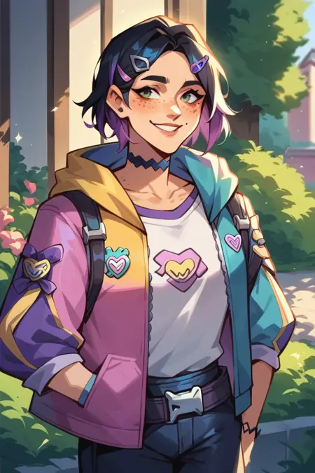 캐릭터의 이미지와 일치하는 토큰을 추가하거나 제거해 보세요: 목걸이, 배낭, 주근깨, 머리핀, 자켓, 후디.