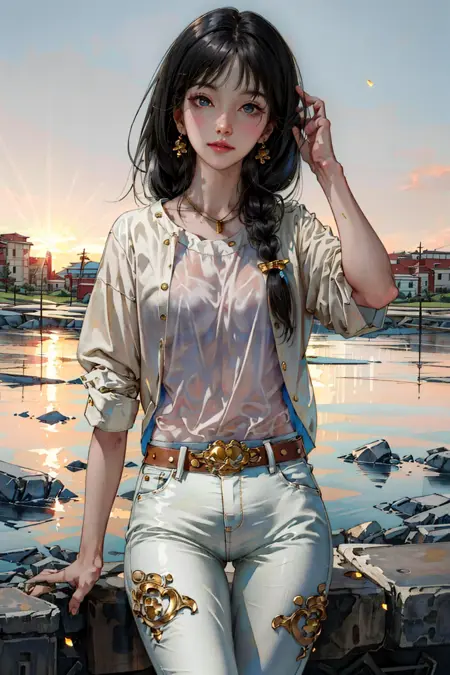 Prompt: (long braided hair), (bangs), with in frame, ultra-detailed, 8k, masterpiece, blue color, (volumetric lighting), (ambient light), realistic shadows, (fullbody:1), (cowboy shot), shirts, pants, perfect body, body well:1, leg well:1, arm well:1 , (GoodhandsV3)