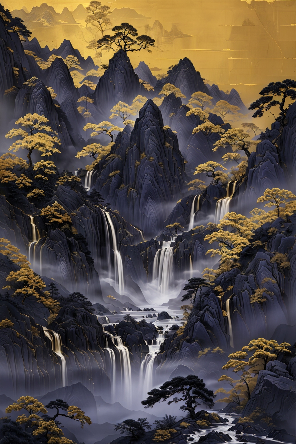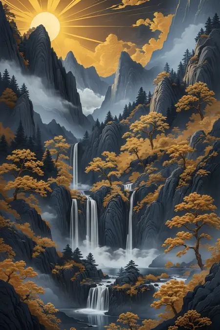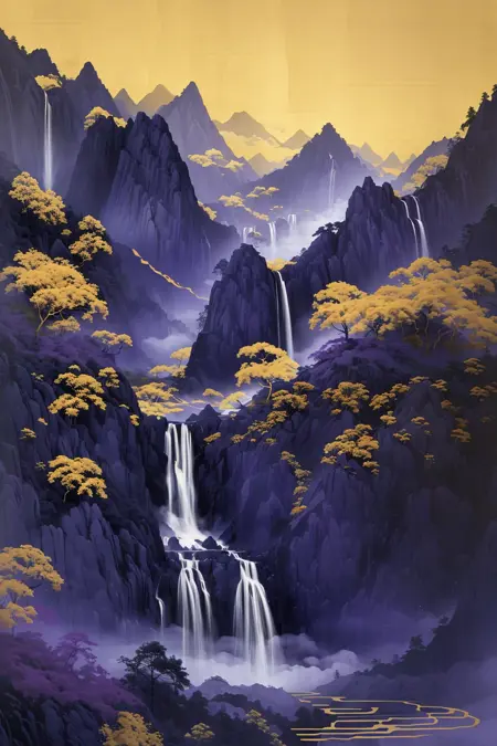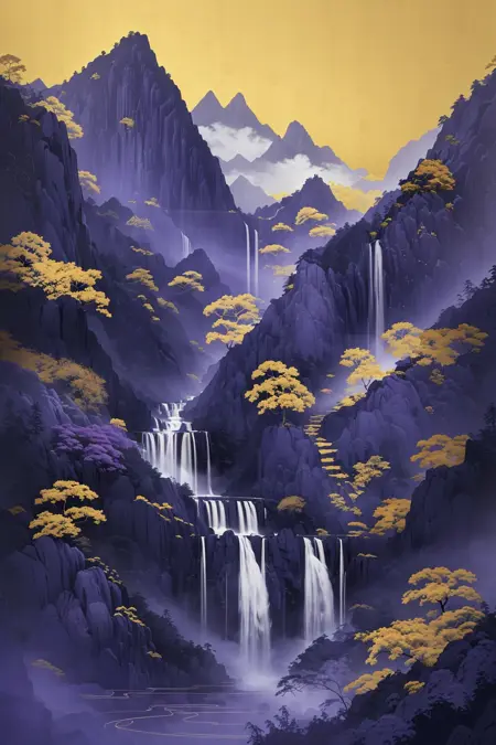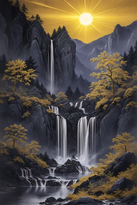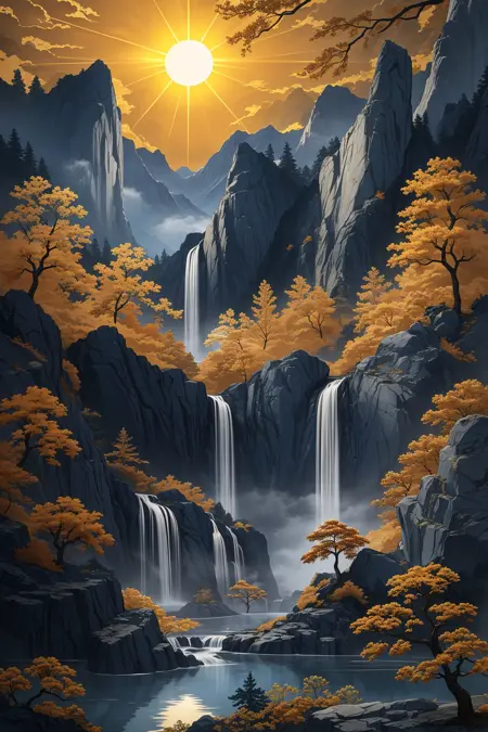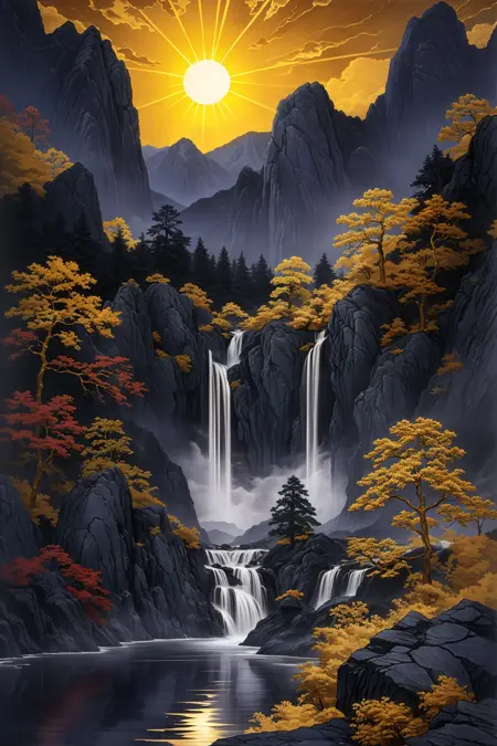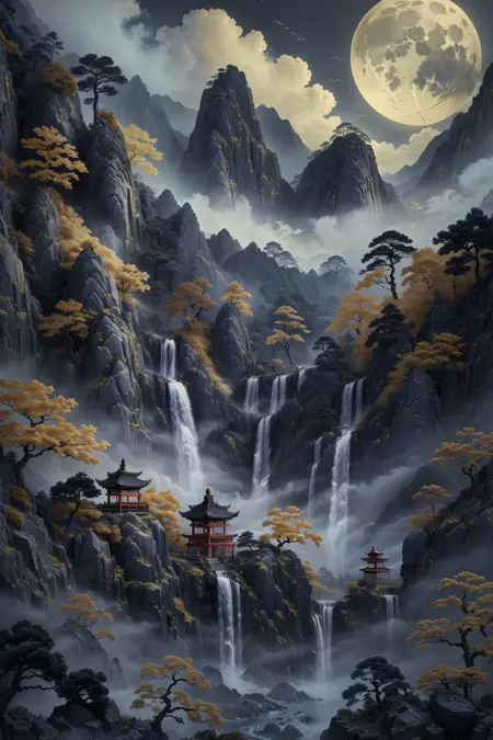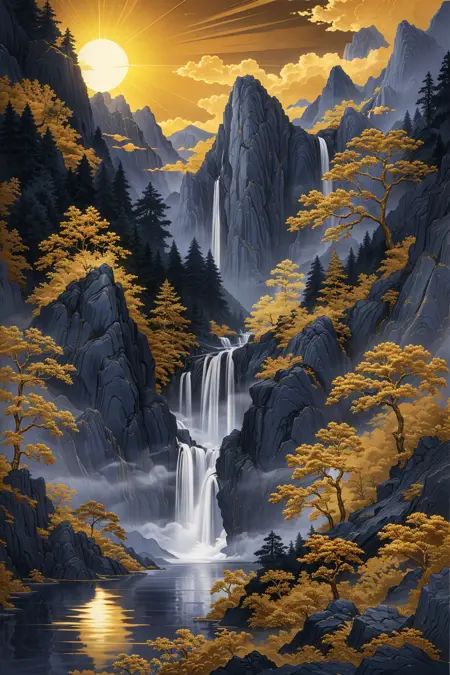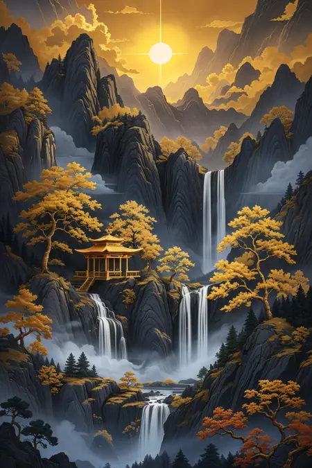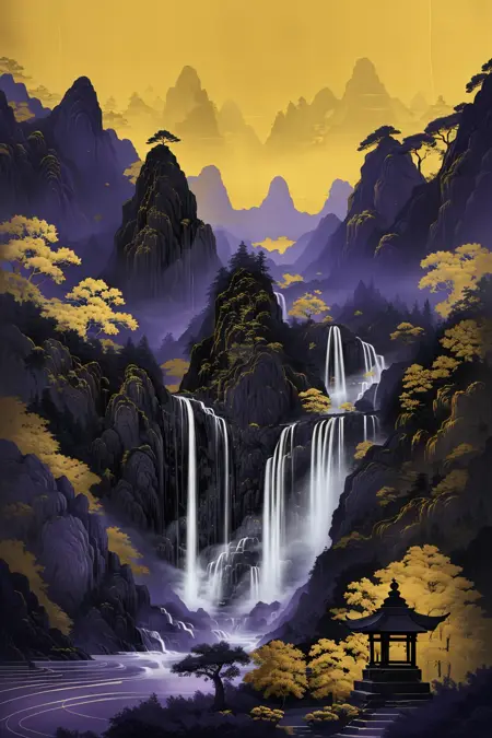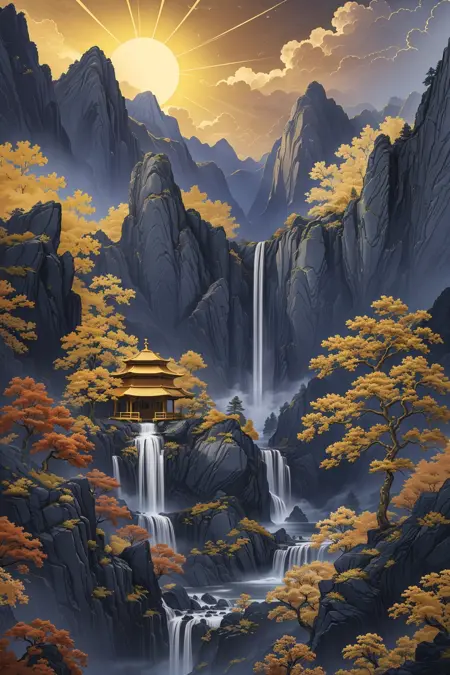 推奨プロンプト:Masterpieces, HD, 16k, scenery, mountains, trees, ancient buildings, waterfalls, sun, stones