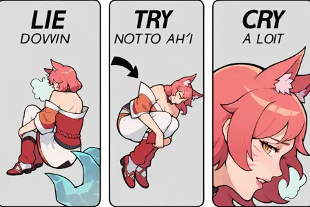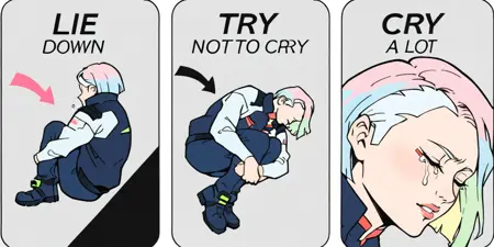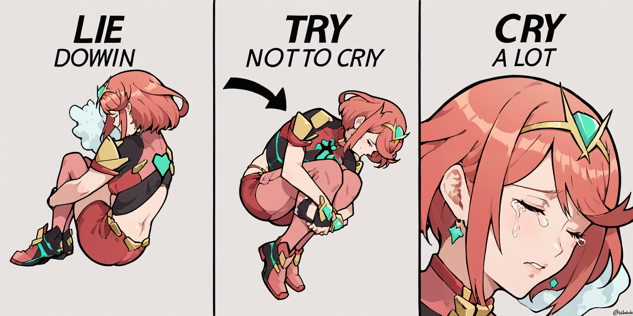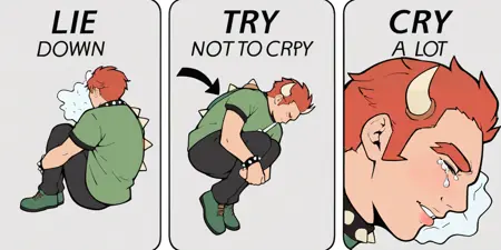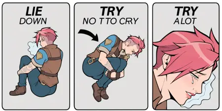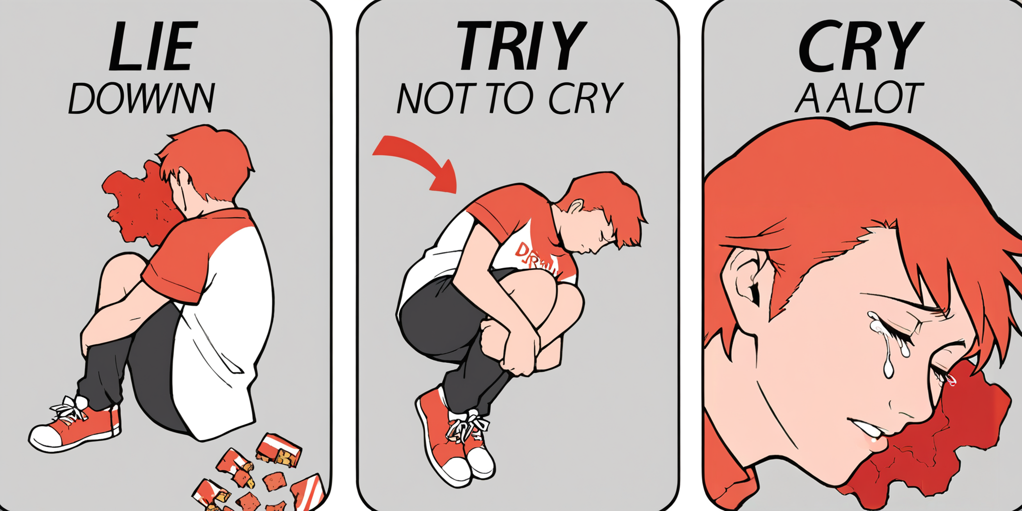 <subject>, m3m3, comic, english text, arrow \(symbol\), eyes closed, tears, fetal position