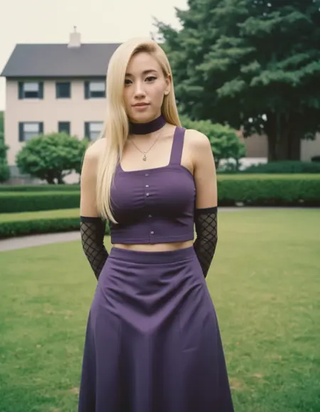 空白期:空白期,长裙,紫色围裙裙,紫色高领上衣,网状臂套,露脐,肚脐,无脚趾鞋,