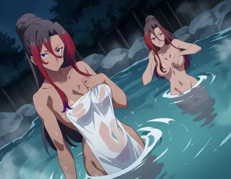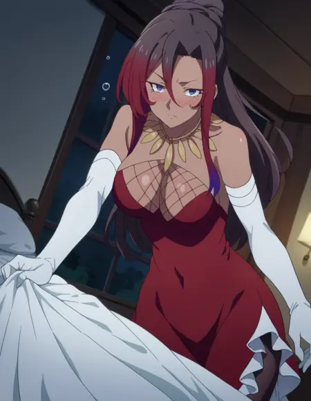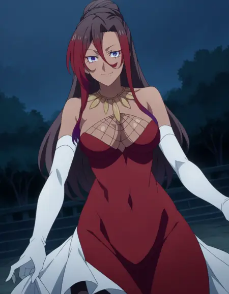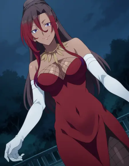 sylvia, long hair, brown hair, hair between eyes, ponytail, red hair, multicolored hair, dark skin, dark-skinned female, purple eyes,