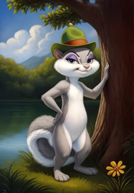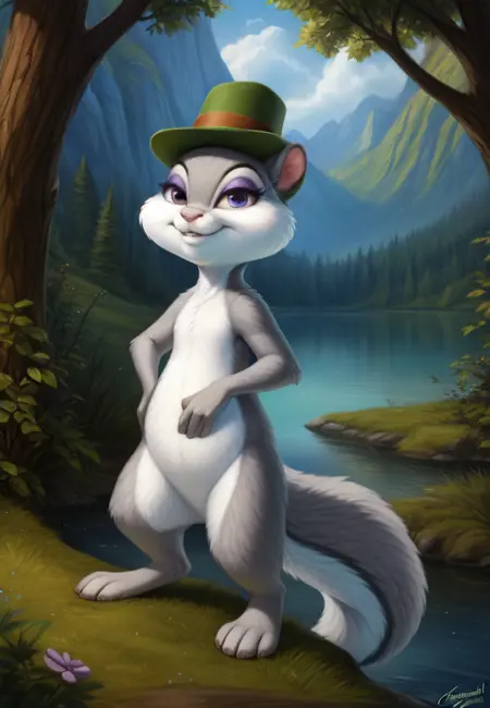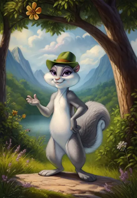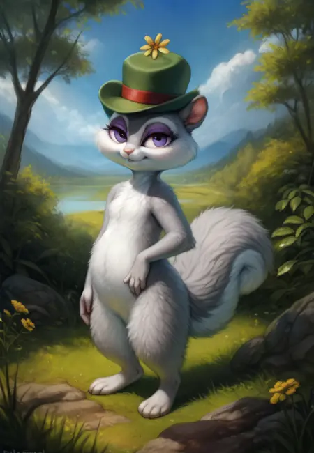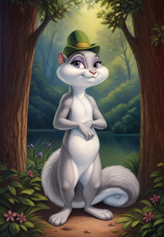Squirrel, green hat with flower, purple eyelids, gray fur,
