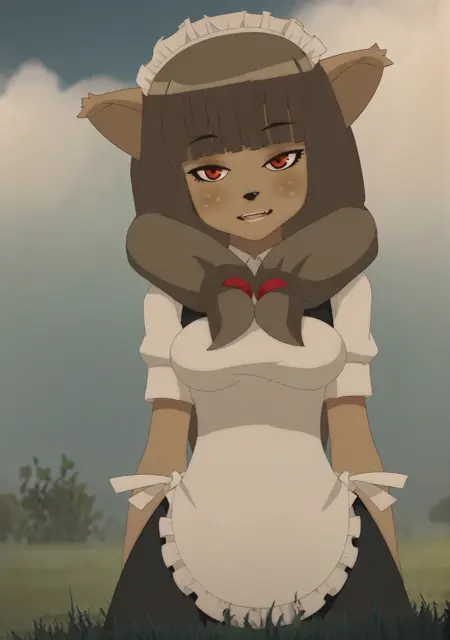 1girl, , miranda \(wakfu\), furry, animal ears, brown hair, blunt bangs, long hair, red eyes, light freckles, mirandadress, red dress, black long skirt, red detached sleeves,