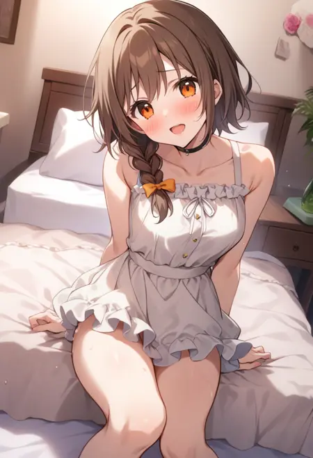 senkawa chihiro, オレンジ色の目, 茶色の髪, 横編み, 赤いスクランチ,