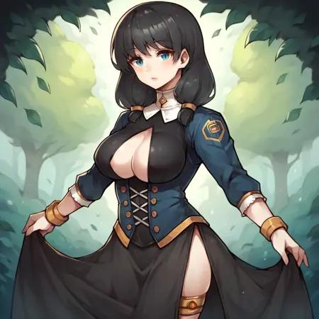 Tags: kuro_astlibra,black hair,bangs,low twintails,blue eyes,large breasts, black dress, clothing cutout, long sleeves, side slit,metal garter,
