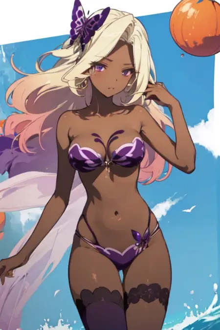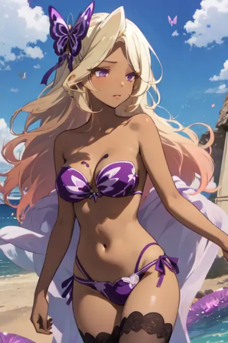 UzumeOnigiri, 1girl, long hair, blonde hair, hair ornament, thighhighs, navel, cleavage, bare shoulders, strapless, medium breasts, purple eyes, purple bikini, dark skin, dark-skinned female, butterfly hair ornament