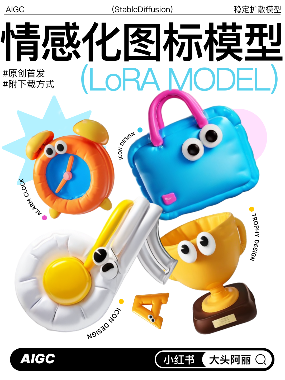 可应用于手机主题图标、小组件、主KV等,通过ControlNet控制形状,也可自行添加物品及颜色关键词以控制出图。