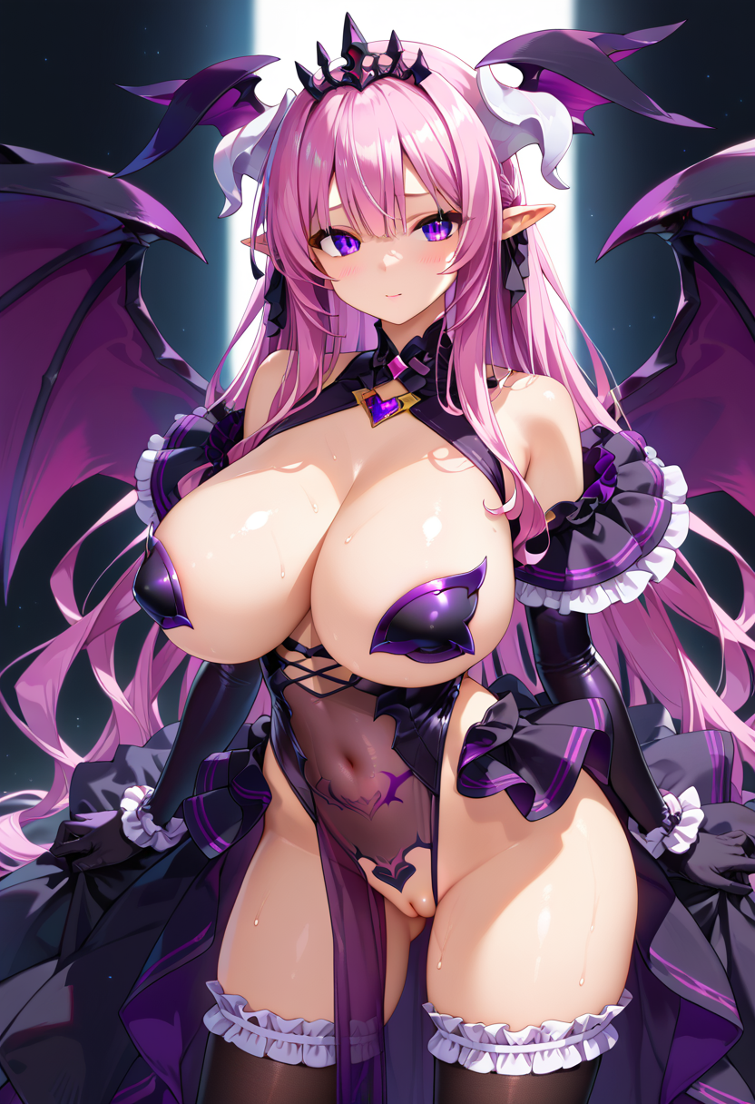 lora:luxlia-05:0.9, 1girl, luxlia, very long hair, wings, horns, cleavage, pink hair, purple eyes, pointy ears, demon girl, tiara, cleavage tattoo, slit pupils, frills, white demon horns,nipple pasties, revealing clothes, gloves, thighhighs, black thighhighs, demon tail, pelvic_curtain, pussy pasties, covered pubic tattoo, covered_navel,