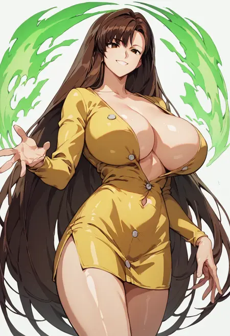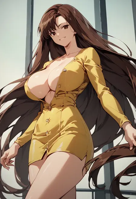 lora:ninomiya_hinako-04:1.0, 1girl, ninomiya_hinako, 棕色头发,极长发,锁骨,黄色裙子,短裙,扣子裙,深V领裙,长袖,(白色高跟鞋:0.9),