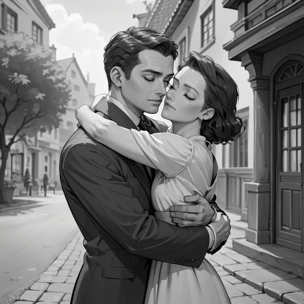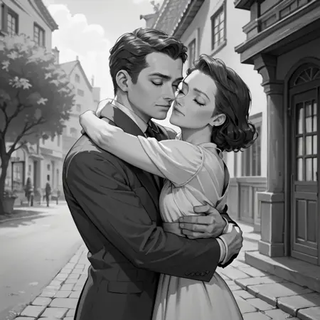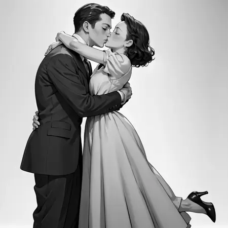 主提示词:hud_40s_lv, 单色, 灰度, 1个女孩, 1个男孩, 拥抱, 西装, 连衣裙, 简单背景, 电影颗粒感, 电影感