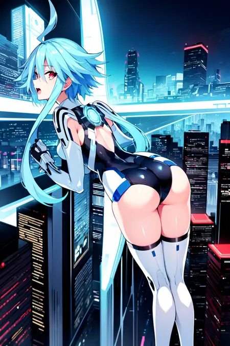 등장시키려면 다음 태그를 사용하세요: 흰색 하트, 1녀성, 파란 머리, 빨간 눈, 기호 모양의 동공, 긴 머리카락이 있는 짧은 머리, 파워 기호, 아호지, 어깨 노출, 레오타드, 팔꿈치 장갑, 흰색 바디수트