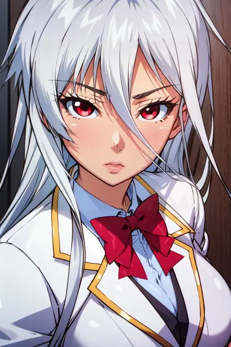 very long hair, white hair, red eyes, lips, large breastsAttire