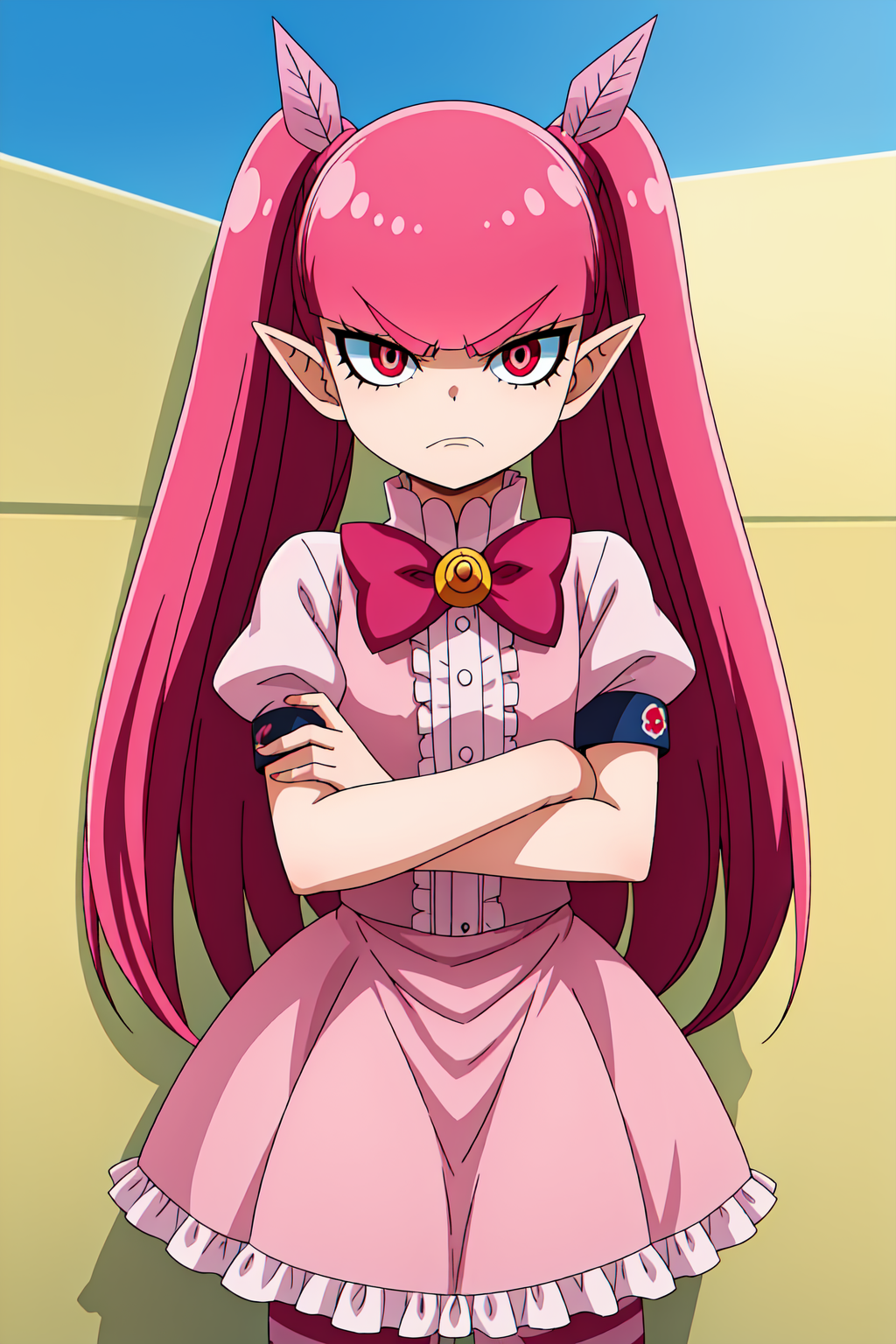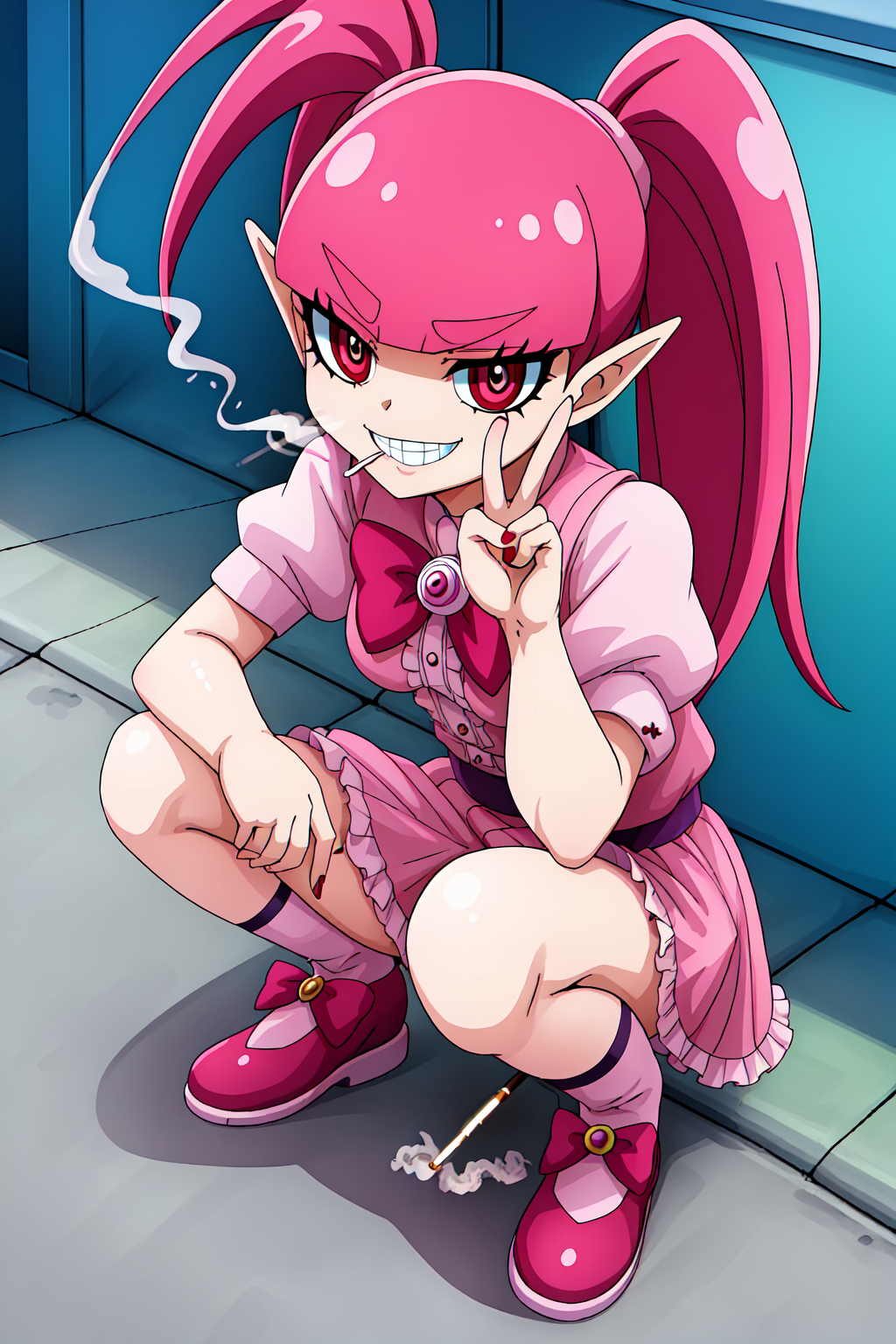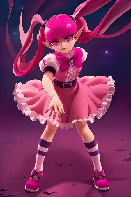 분홍색 눈, 분홍색 머리카락, 드레스, 줄무늬 양말