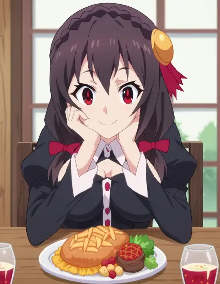 yunyun, black hair, hair ornament, red eyes, bow, braid, crown braid,
