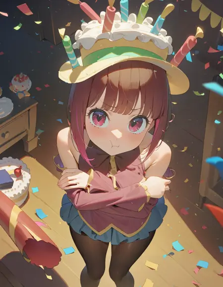 happy birthday, fruit, candle와 같은 관련 태그를 추가할 수도 있습니다. 맥락에 따라 케이크 위에 장식된 빨대 모자 같은 특정한 이미지를 생성할 수 있습니다. 그런 이미지를 원하지 않는다면 부정적 키워드(예: "straw hat")를 사용하세요.