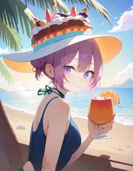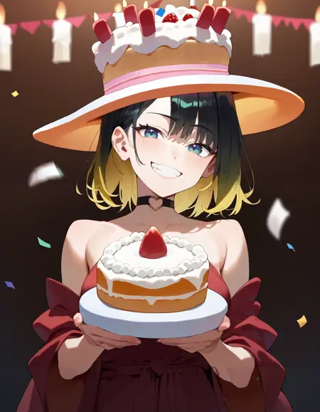 你还可以添加相关标签,例如 happy birthday、fruit 或 candle。根据上下文,可能会生成类似顶部有蛋糕的草帽等特定内容。如果不想这样,请使用否定词(例如 "straw hat")。