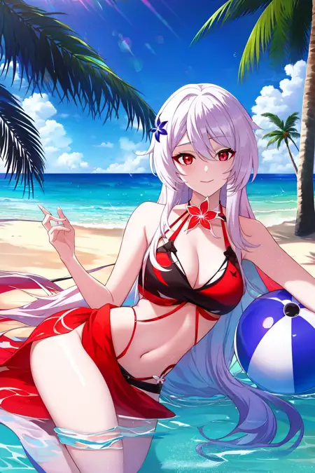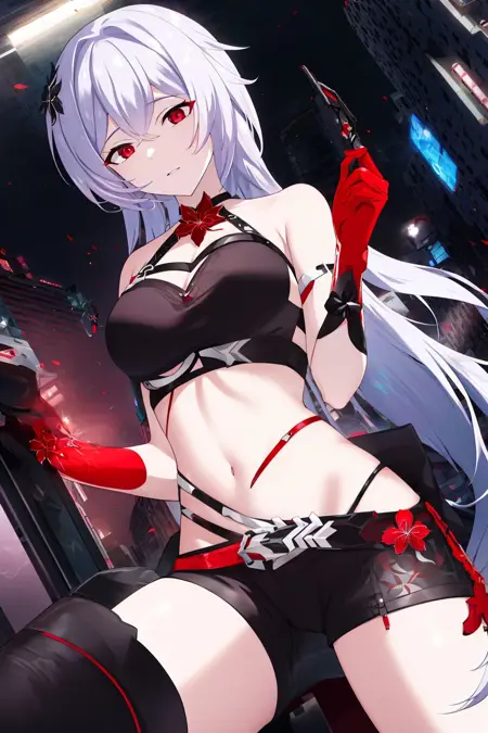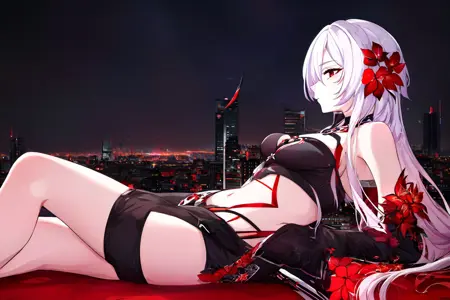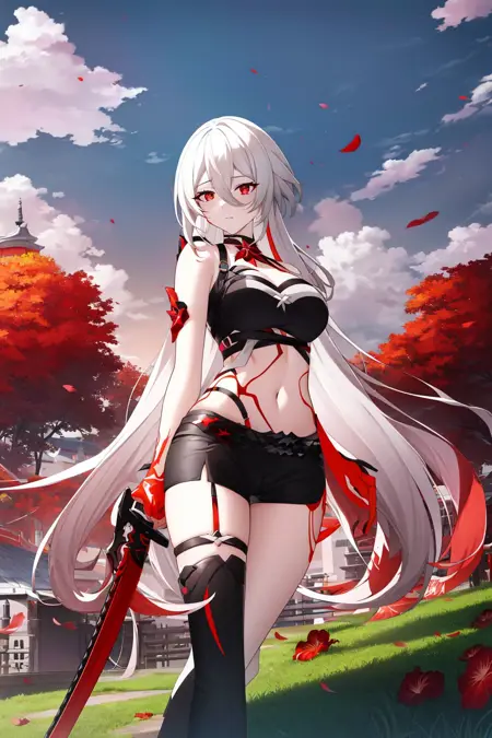 - Additional tags of interest: "red flower", "tattoo" or "bodypaint" (for the red lines on her body), "holding sword"+"katana" (might take a couple of gens before it get's her katana right)