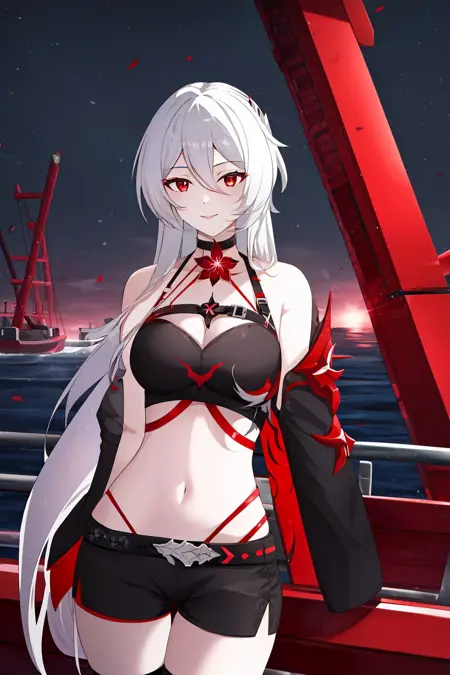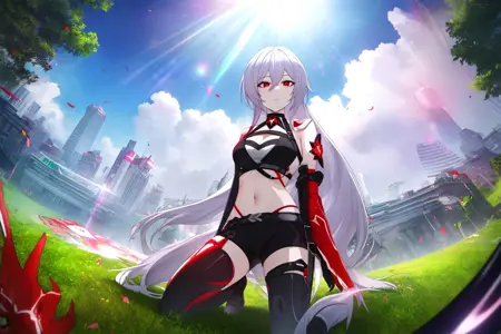lora:redacheron\_SD:0.75 redacheron, 1girl, long hair, white hair, red eyes, medium breasts, sleeveless shirt, black shorts, cleavage