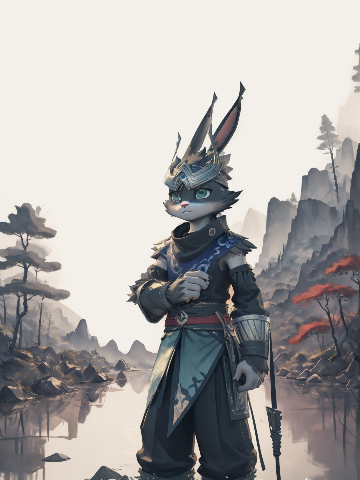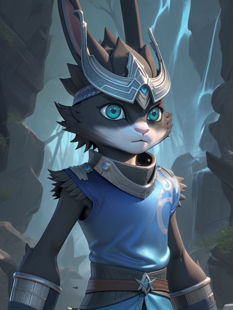- 빙류: bingliu, furry, 1boy, grey fur, rabbit ears, helmet, blue shirt, sleeveless, armor, blue eyes