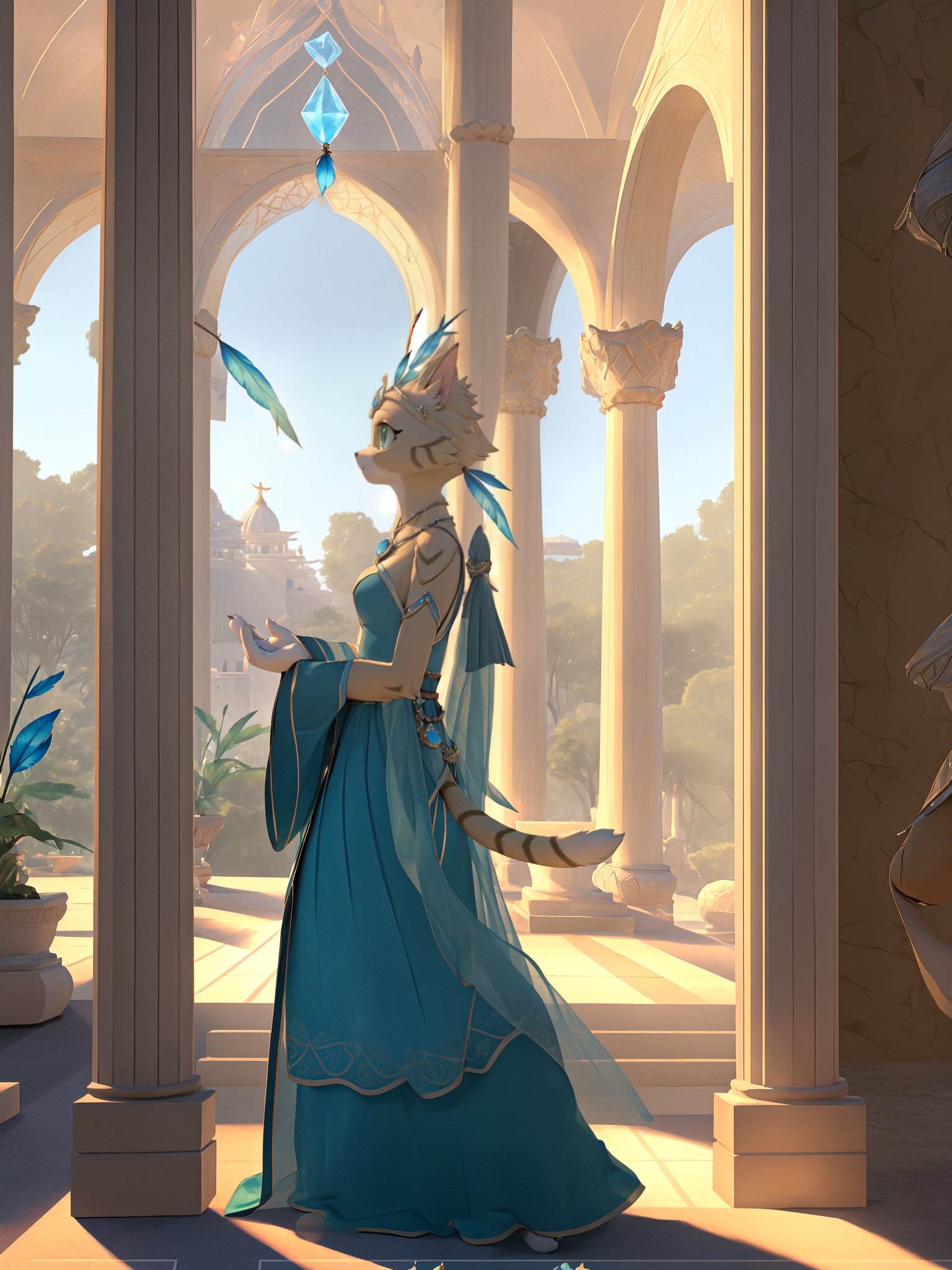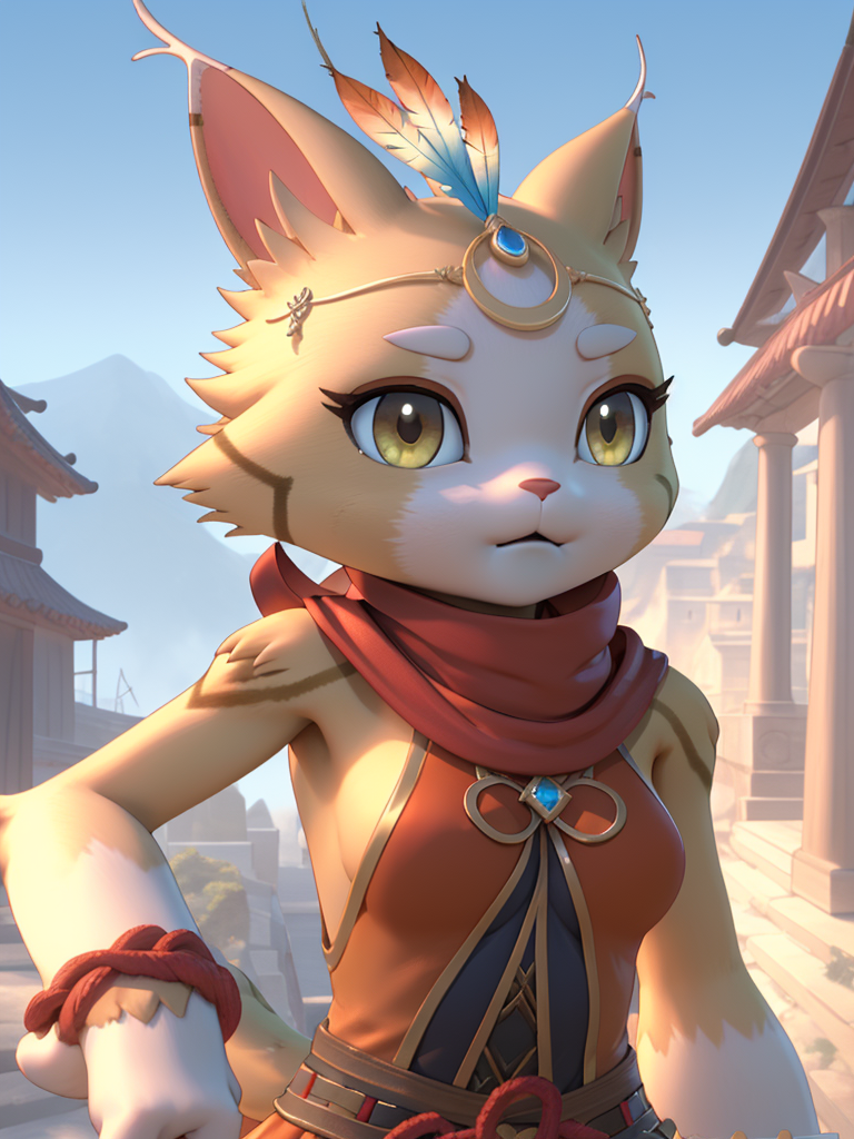 서월: xiyue, 1girl, furry_female, yellow fur, sleeveless, red scarf, cat_girl, feather_hair_ornament, gem,