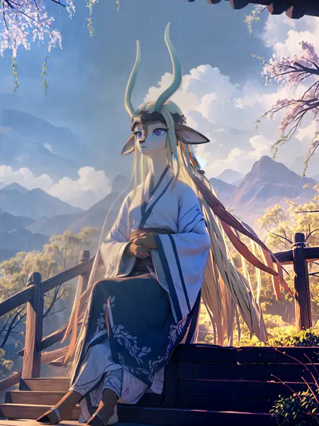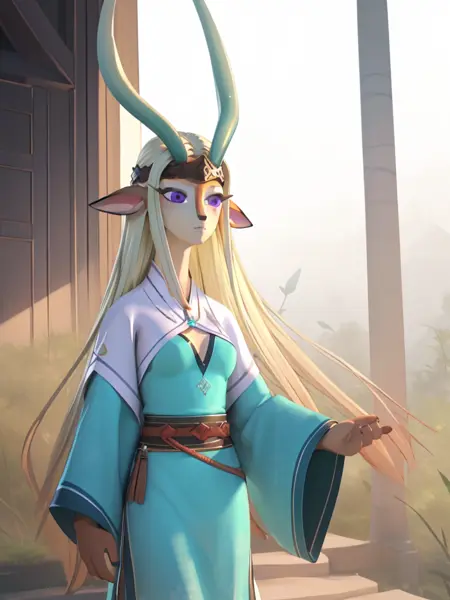 - jubing, luniang, furry_female, blue_antlers, blue dress, purple_eyes, blonde hair, jewelry, mole_under_eye, cleavage cutout, wide_sleeves
