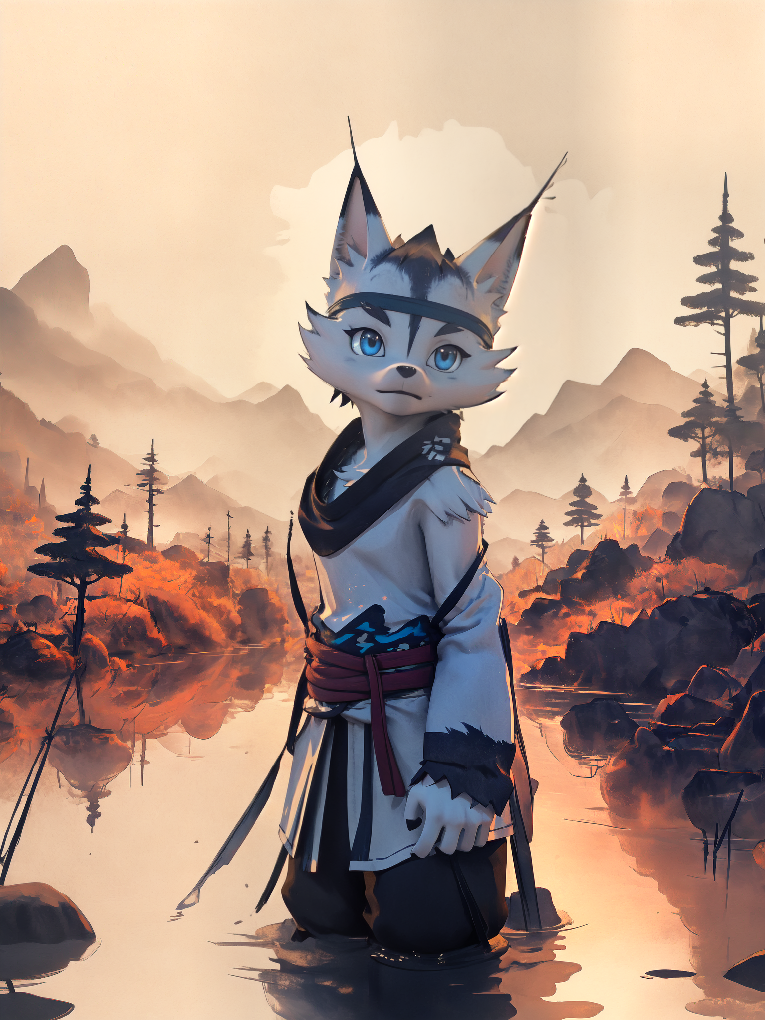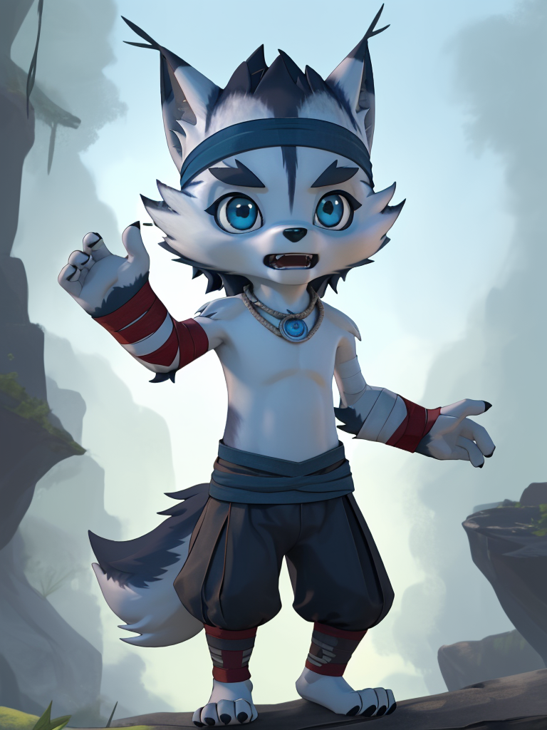 소야: xiaoye, 1boy, topless, furry, wolf_tail, wolf_boy, bandana, bandaged_arm, pants, necklace, blue_eyes, (chibi, child 프롬프트를 추가하면 어린 소야 생성 가능) 부정 프롬프트 추천: teeth, snout