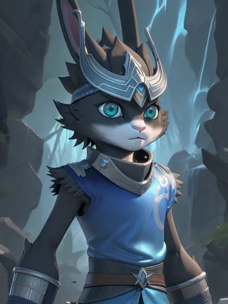 빙류: bingliu, 1 boy, furry, belt, black fur, blue shirt, rabbit ears, green eyes, blue eyes, helmet, pointy ears, sleeveless, vambraces.