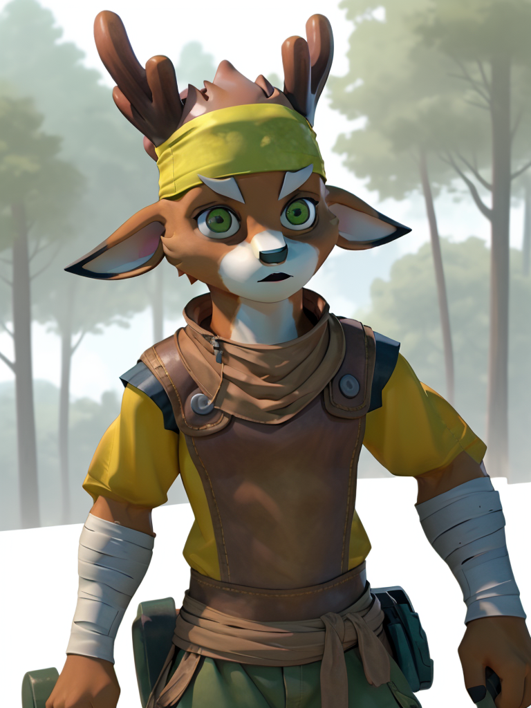 녹형: luge, 1boy, furry, bandaged_arm, bandana, brown fur, green_eyes, vest, antlers,