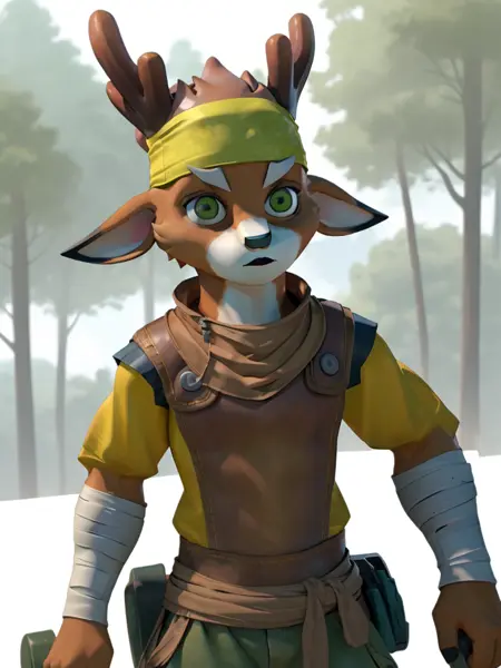 - 녹형: luge, deer ears, yellow headband, furry male, green eyes, deer antlers, scarf, yellow shirt