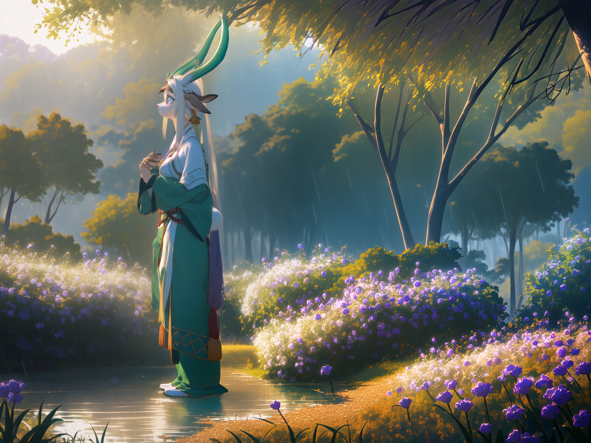 - 녹양: luniang, furry female, deer ears, green antlers, white fur, purple eyes, gradient hair, sidelocks, wide sleeves, cleavage cutout, mole under eye, necklace