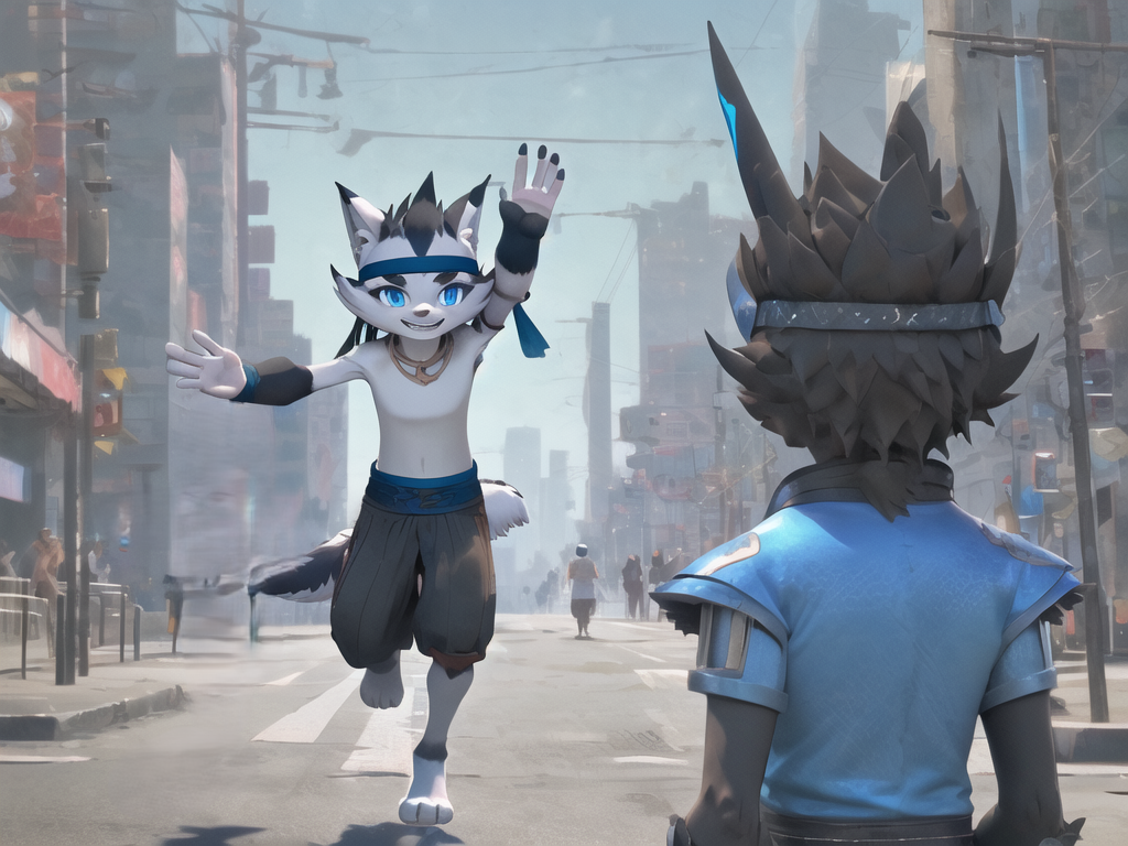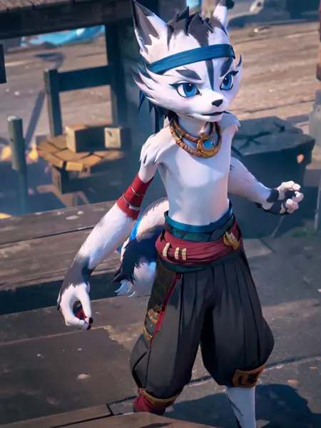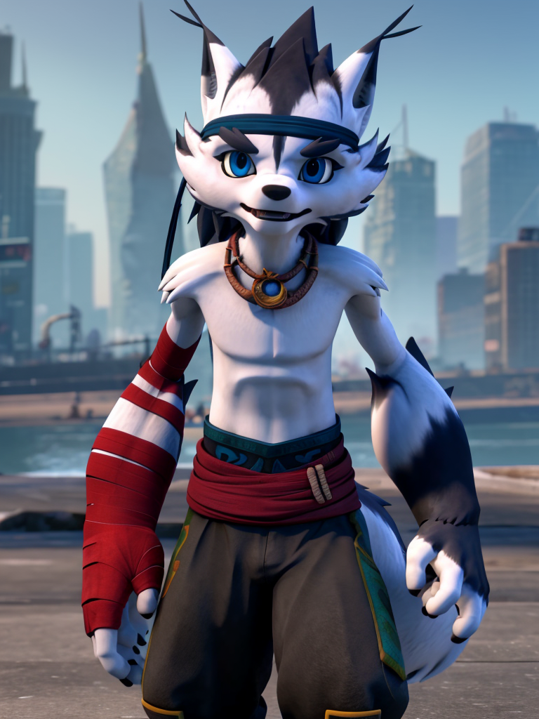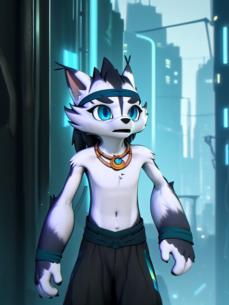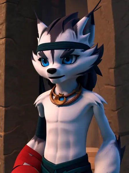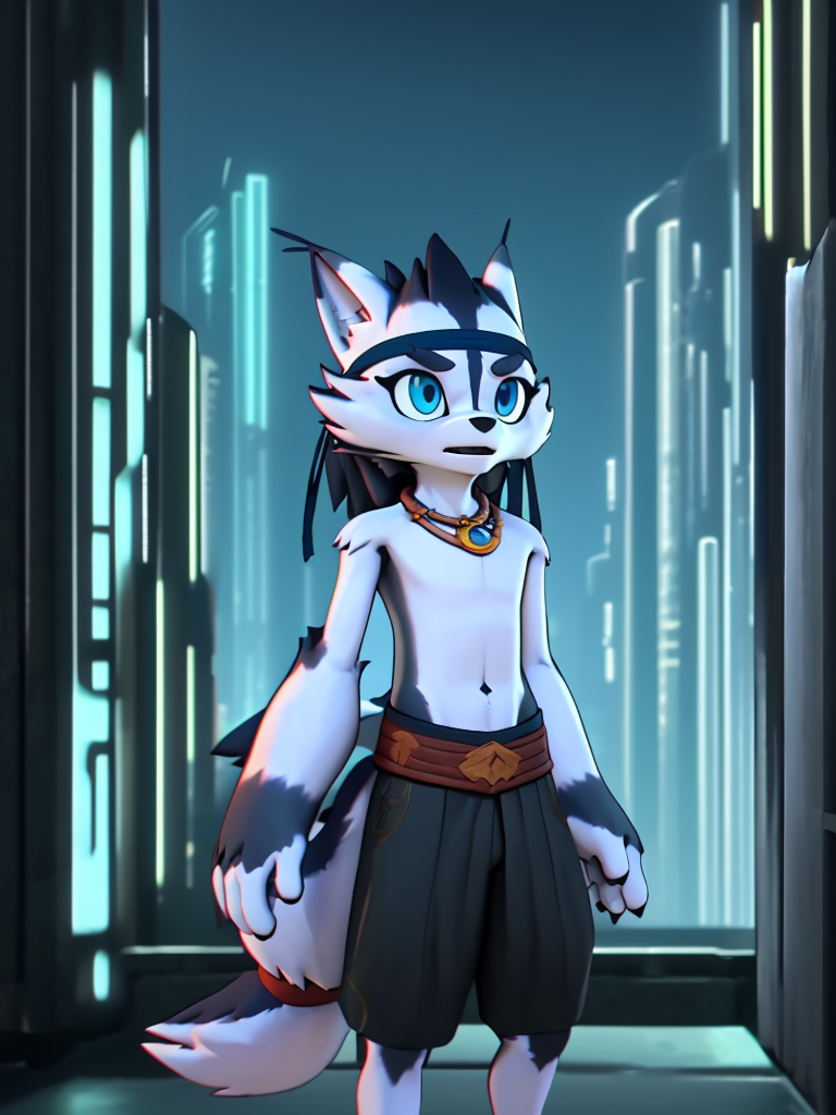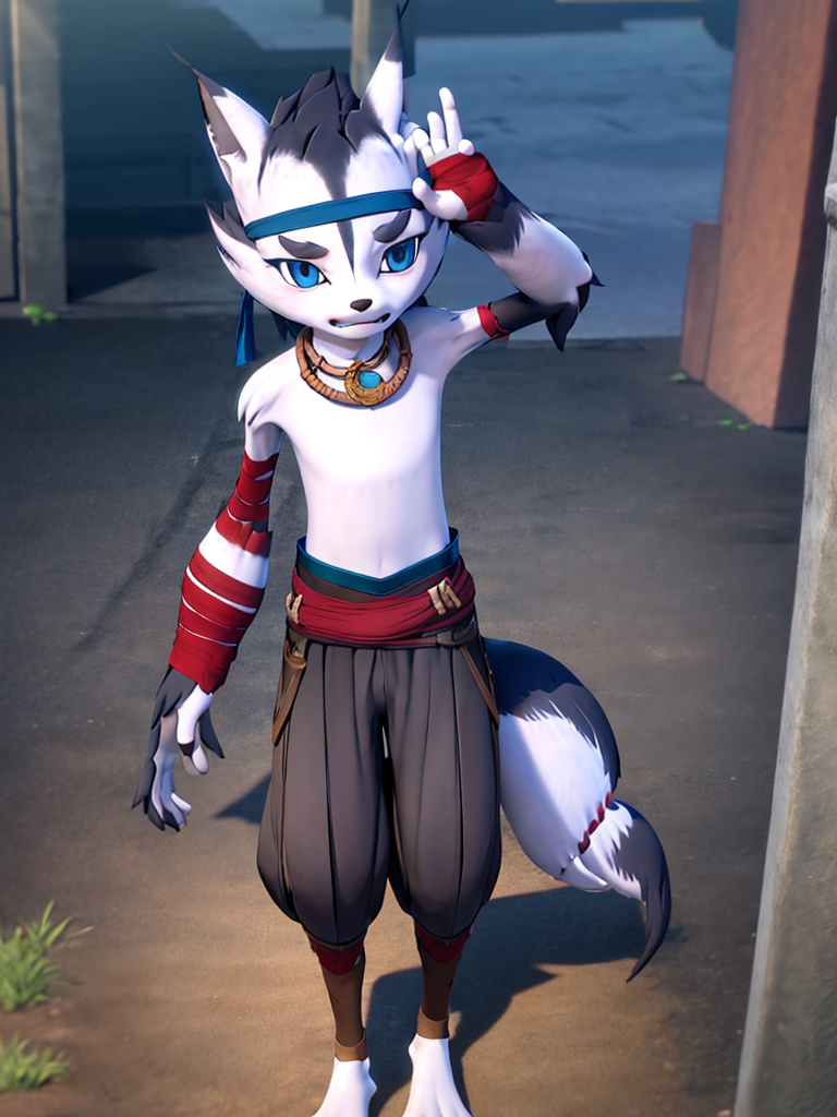小野:xiaoye, 1 boy, furry, topless, wolf tail, wolf boy, bandana, bandaged arm, pants, necklace, blue eyes.(添加'chibi'和'child'提示词可生成年幼的小野)建议负向提示词:teeth, snout。