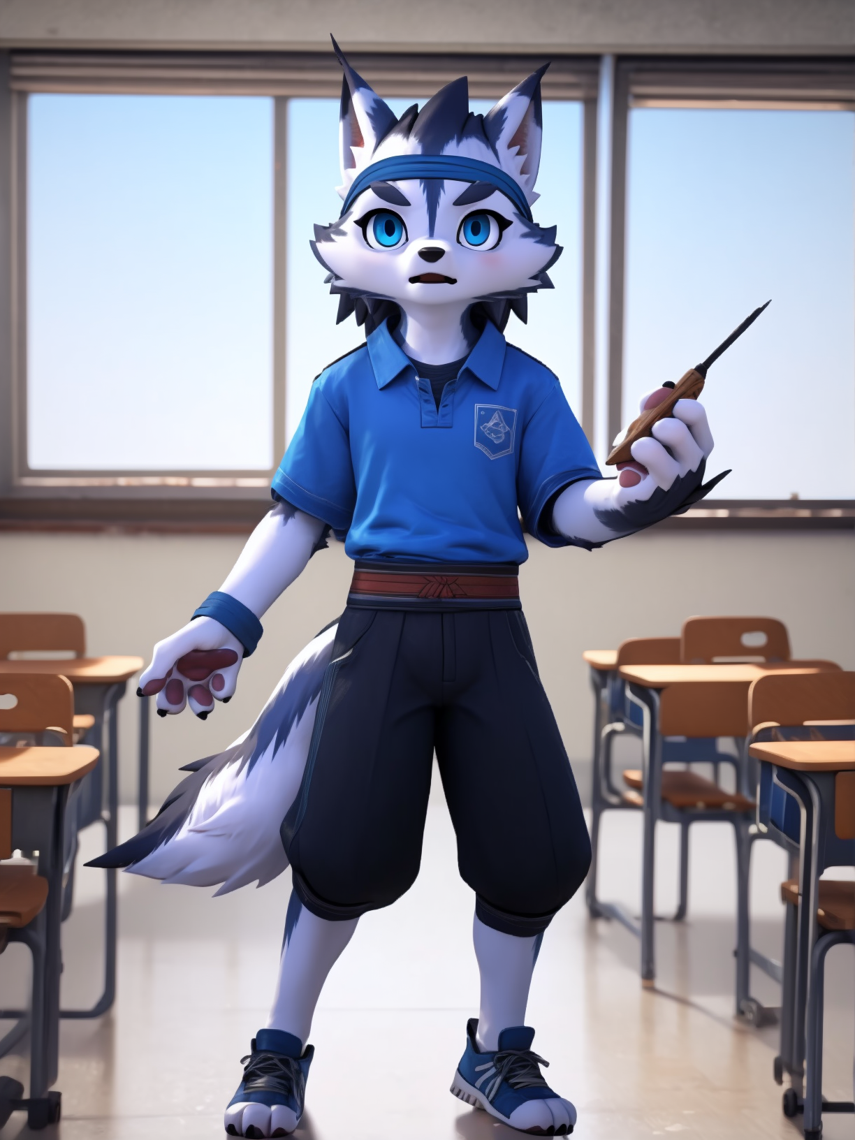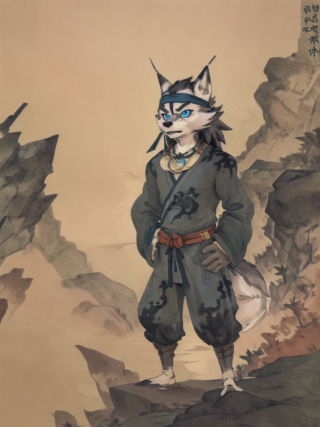- jubing, xiaoye, furry, wolf boy, headband, blue eyes, topless, bandaged arm, tail_belt, necklace, pants