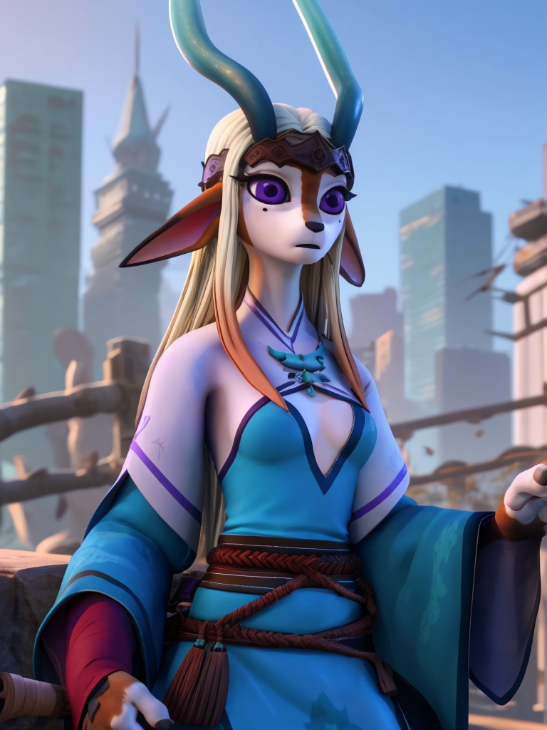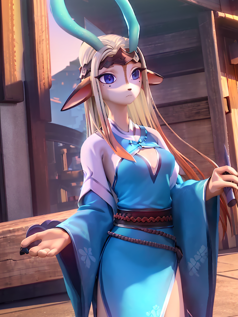 - jubing, luniang, furry_female, blue_antlers, blue dress, purple_eyes, blonde hair, jewelry, mole_under_eye, cleavage cutout, wide_sleeves