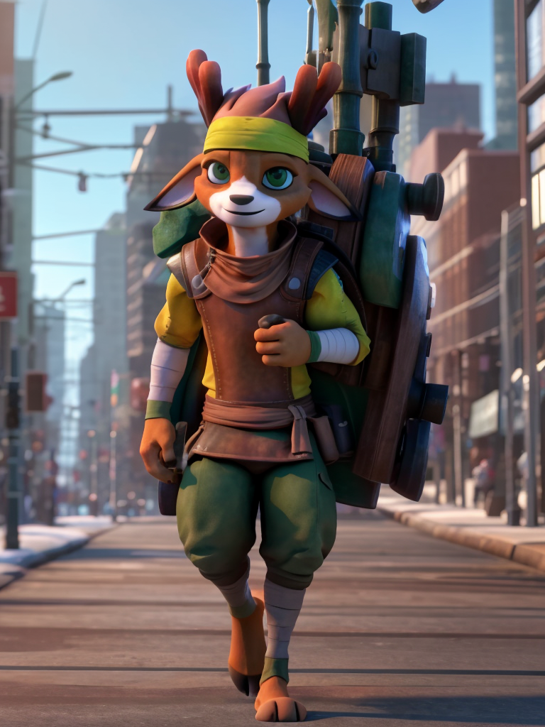 鹿哥:luge, 1 boy, furry, bandaged arm, bandana, brown fur, green eyes, vest, antlers.