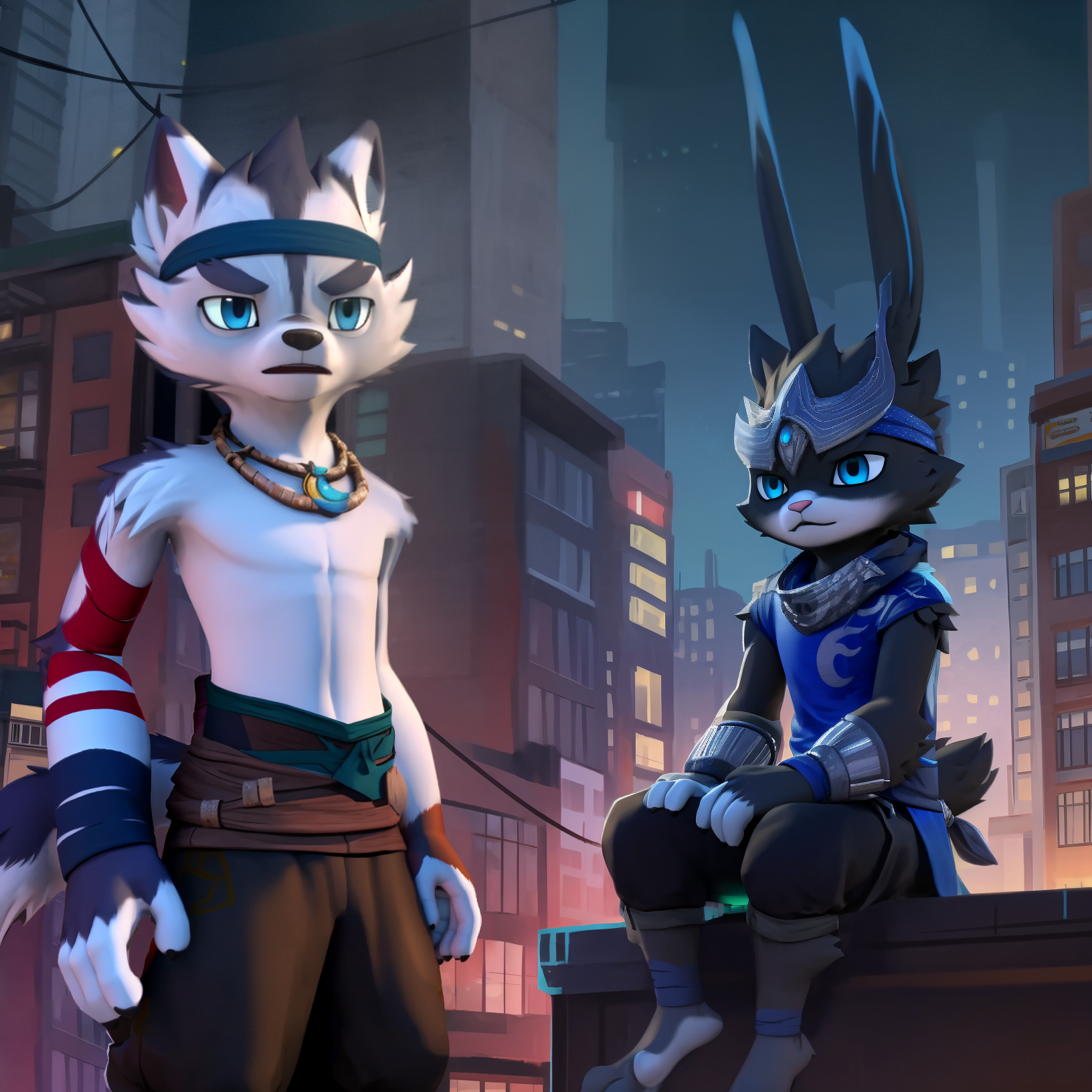 - 小野:xiaoye, furry, wolf boy, 1boy, headband, necklace, red bandaged arm, topless, tail ring, blue eyes, black pants, solo