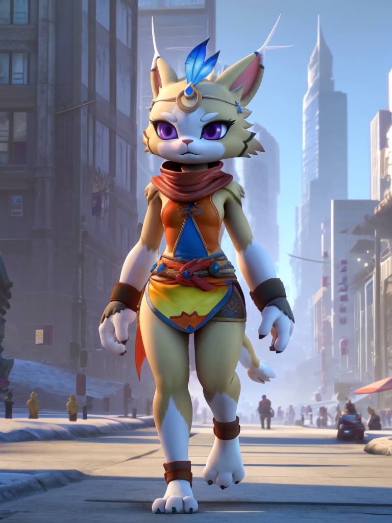 - jubing, xiyue, sleeveless, furry female, 1girl, scarf, purple eyes, jewelry, feathers, solo, clothing, cat_girl, yellow fur