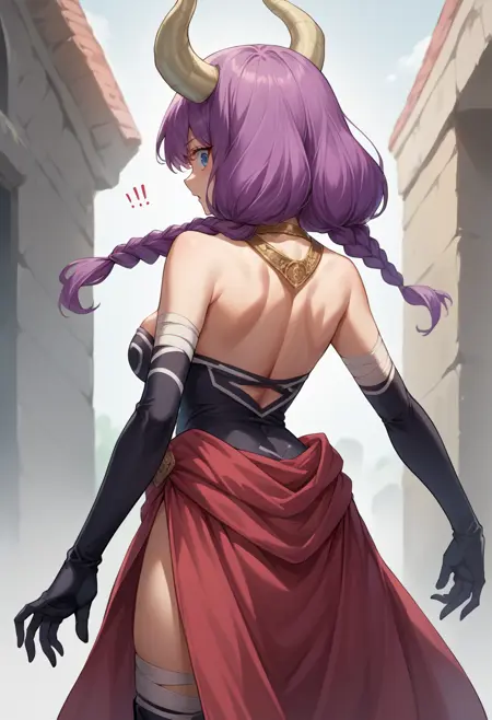 AuraFrieren, 보라색 머리, 파란 눈, 뿔, 긴 머리, 두 개의 트윈 땋은 머리, 목걸이, 어깨가 드러난 셔츠, 검은 셔츠, 배꼽 노출, 흰 치마, 빨간 허리 망토, 팔꿈치 장갑, 검은 장갑, 허벅지 부츠