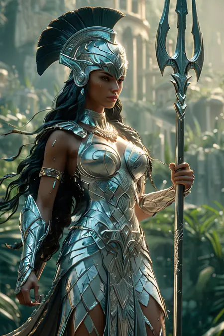 "아름다운 인어공주가 삼지창을 들고 있는 전신 시네마틱 장면, 배경에는 화려한 수중 산호초, 반사되는 빛"
