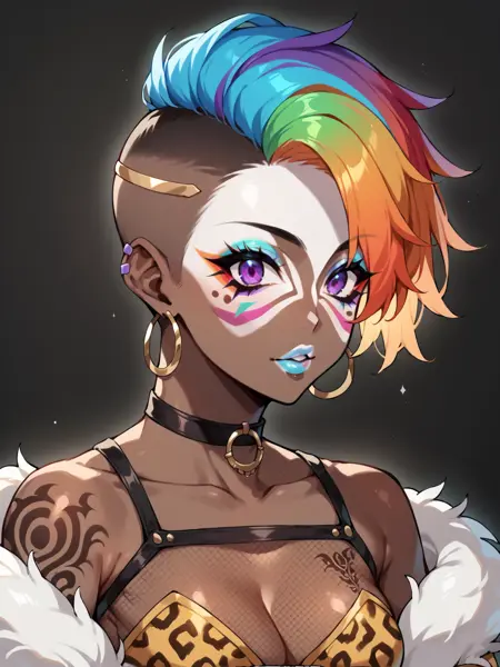 (for face detailer prompt, you can use Score_9, score_8_up, score_7_up, score_6_up, source_anime, 1girl, solo, masterpiece, nose piercing, ear piercing, dark-skinned female, BREAK, (yamanba, white facepaint makeup), star stickers, heart stickers, eyeshadow, very dark skin, (glitter, long thick eyelashes), lora:Yamanba\_Face:0.75)